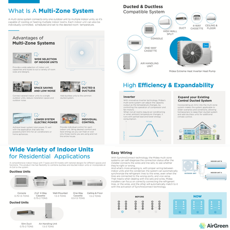 La thermopompe 4-zones MIDEA28 constitue un choix avisé pour toute résidence ou commerce souhaitant un contrôle précis de la température, avec un rendement élevé et une fiabilité à long terme. Son compresseur 48 000 BTU répond aux exigences des grandes surfaces, tandis que sa polyvalence en fait une solution modulable pour différents types de bâtiments.