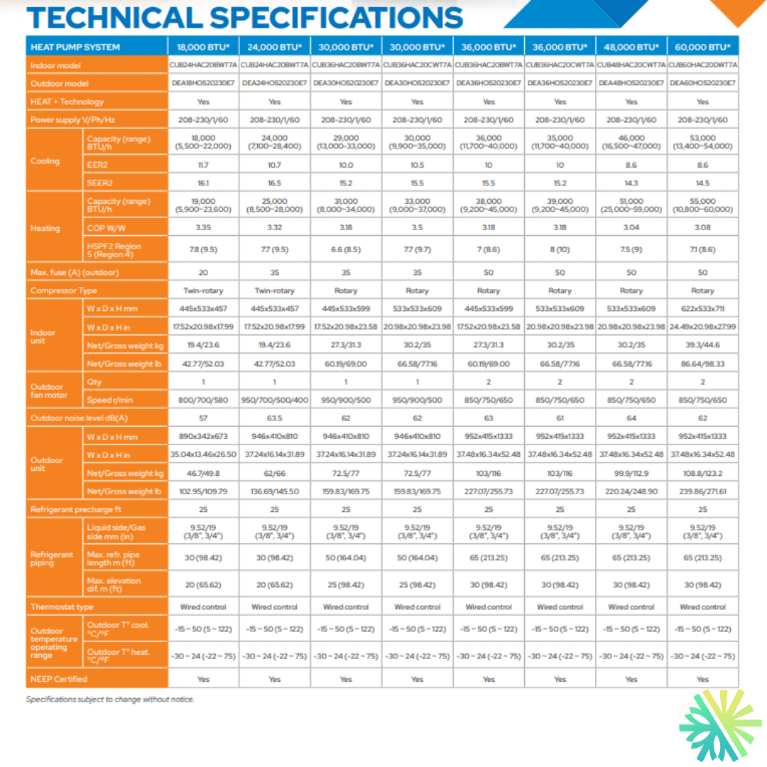 L’unité extérieure CUB24HAC20BWT7A se distingue par son format réduit (35,04 x 13,46 x 26,50 po) et son niveau sonore de 57 dB(A). Dans les quartiers résidentiels denses, cette caractéristique est loin d’être secondaire.