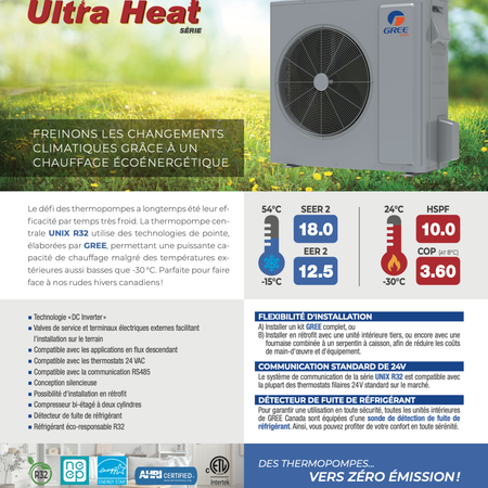 La Thermopompe Centrale GREE UNIX R32 2 tonnes n’est pas une solution théorique ou limitée aux climats tempérés. Elle a été pensée pour offrir un rendement stable même lors des épisodes de froid intense que nous connaissons au Québec.