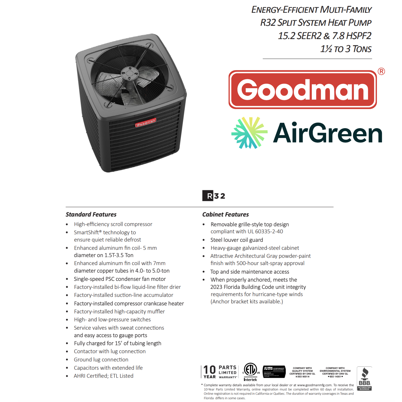 Thermopompe Centrale Goodman GLZS4M R32 | 2 Tonnes | Montréal, Laval, Longueuil, Rive Sud & Rive Nord