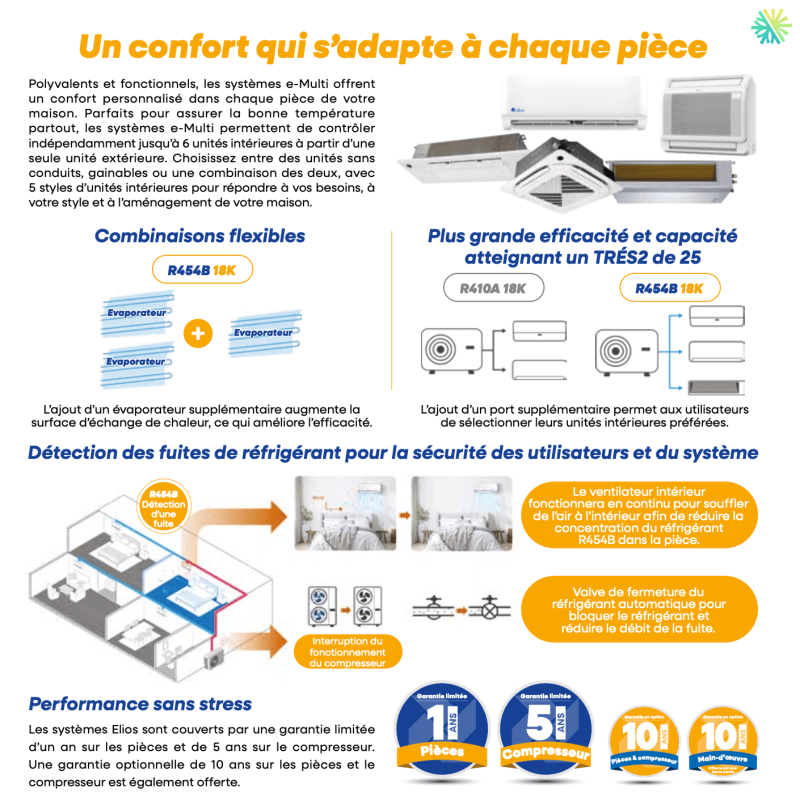 Le système e-Multi intègre des dispositifs de détection de fuite de réfrigérant. En cas d’anomalie, le fonctionnement du compresseur est interrompu et le ventilateur intérieur continue de fonctionner afin de réduire toute concentration potentielle de réfrigérant dans la pièce.