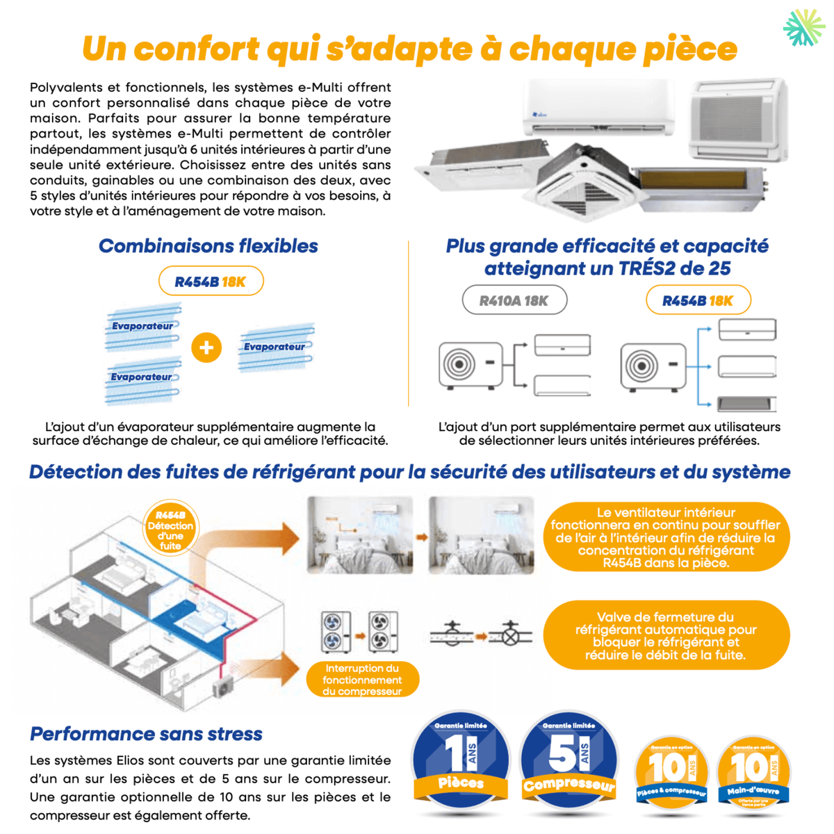La gamme ELIOS E-MULTI intègre également des dispositifs de détection de fuite de réfrigérant, avec arrêt automatique du compresseur et ventilation de sécurité, un aspect souvent sous-estimé mais essentiel dans les installations multizones modernes.