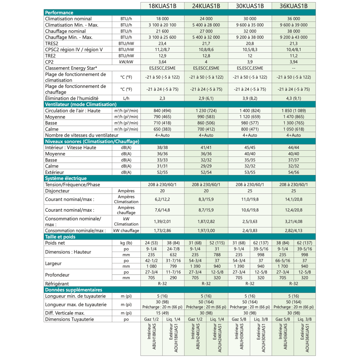 Ce modèle, composé de l’unité intérieure ABUH24KUAS et de l’unité extérieure AOUH24KUAS1, appartient à la série H de Fujitsu, reconnue pour sa fiabilité en conditions hivernales québécoises, avec une capacité de chauffage maintenue jusqu’à -21 °C.