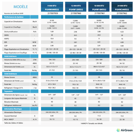 Capacité de refroidissement : 12 000 BTU (plage de modulation 3 071 – 15 695 BTU)