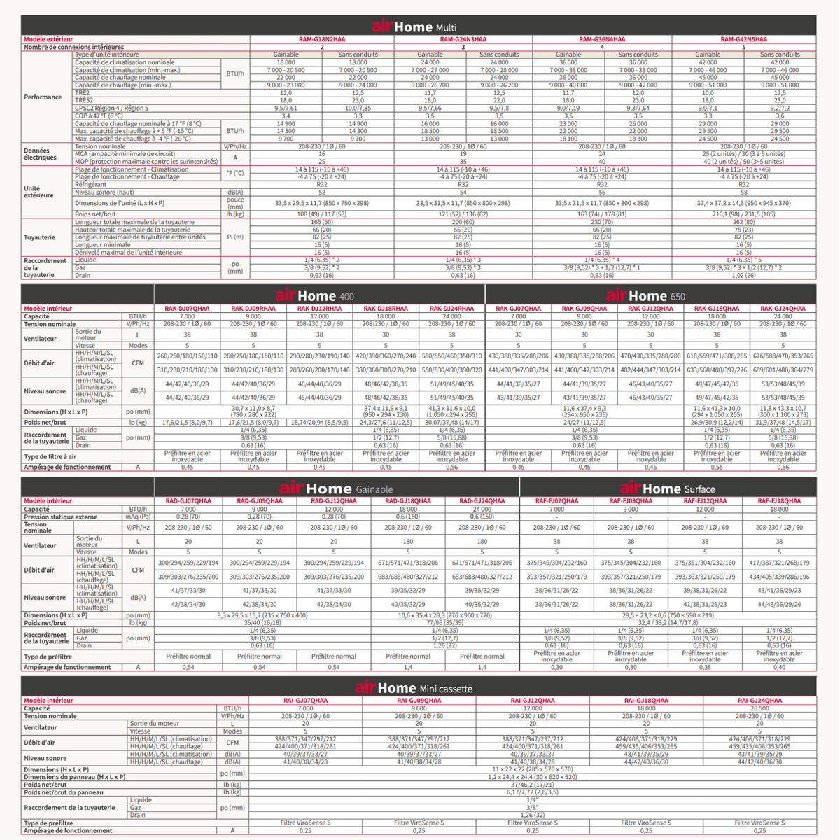 Performances saisonnières : SEER2 jusqu’à 23,0, HSPF2 jusqu’à 7,2–9,2 selon région/configuration des têtes.