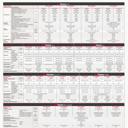 Plages : 7 000–20 500 BTU (froid), 9 000–24 000 BTU (chaleur) selon têtes.