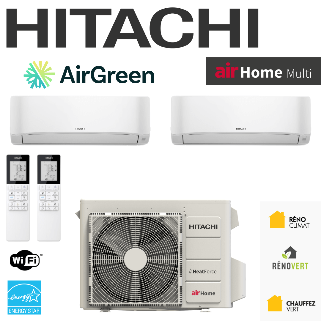 Chez AirGreen, nous installons la thermopompe murale DoubleZone HITACHI airHome Multi (RAM-G18N2HAA, 18 000 BTU) pour les propriétaires qui veulent climatiser et chauffer deux espaces distincts avec un seul compresseur extérieur, sans compromis sur l’efficacité, le silence et la durabilité. Avec deux têtes murales au choix (7 000 à 24 000 BTU), des filtres avancés et une plage de chauffage continue jusqu’à –20 °C, ce système coche les bonnes cases pour nos hivers montréalais et les canicules estivales. Selon la brochure officielle airHome Multi : SEER2 jusqu’à 23.0, HSPF2 jusqu’à 7.85; FrostWash, Mold Guard, capteur de fuite R32, Wi-Fi optionnel SPX-WFA01; tableau des performances et dimensions détaillées pour le modèle RAM-G18N2HAA (2 sorties) – pression sonore extérieure 52 dB(A).