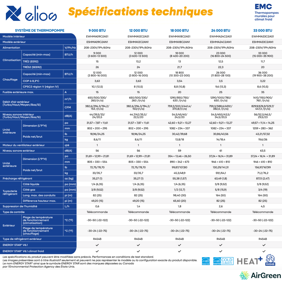 Chez AirGreen, nous croyons qu’un système de chauffage, ventilation et climatisation (CVAC) doit avant tout s’adapter à la réalité du climat québécois. La thermopompe murale ELIOS EMC 24 000 BTU, avec son réfrigérant R-454B et sa technologie Inverter Heat+, incarne parfaitement cette philosophie.