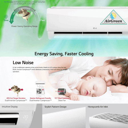 Le compresseur à onduleur de la thermopompe DualCool Prestige maintient la température souhaitée en adaptant facilement sa vitesse de façon continue. De plus, grâce à sa plage de fonctionnement écoénergétique, le compresseur à double onduleurMC de LG permet même d’économiser jusqu’à 70% plus d’énergie et de refroidir une pièce jusqu’à 40%+ plus rapidement que les systèmes classiques à compresseur de la compétition!