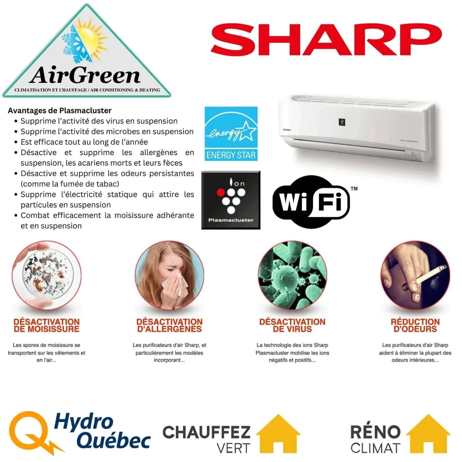 En plus d’être une entreprise japonaise centenaire et leader en technologie, SHARP est présent dans la climatisation, le chauffage et la purification d’air depuis 1985. Nous sommes fiers de travailler en partenariat avec une entreprise qui dispose de vastes connaissances techniques et qui base son modèle d’affaires sur l’innovation. AirGreen et Sharp partagent la mission de fournir des solutions qui permettent d’améliorer le standard de vie et le confort à la maison des clients.