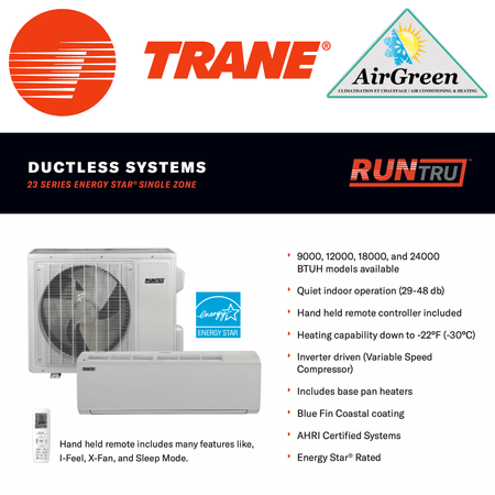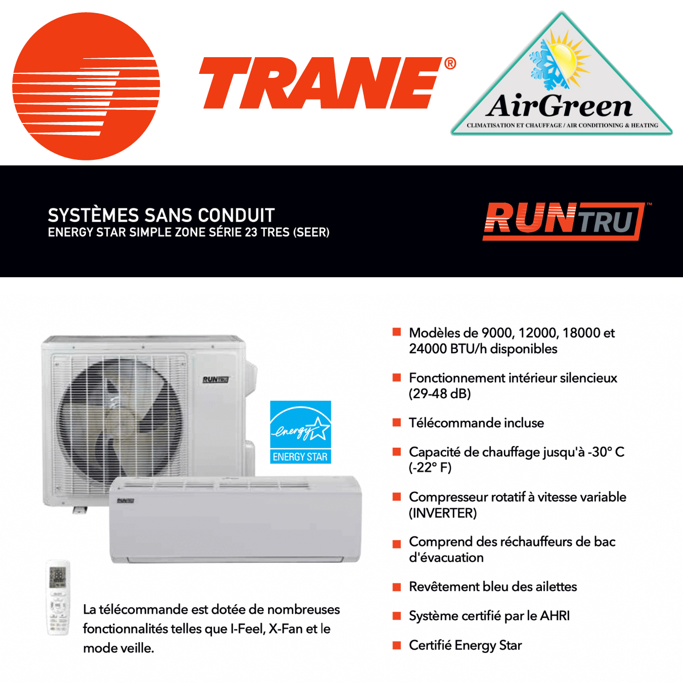 Installation et distribution du mini split Trane RunTru 23 SEER de 12 000 BTU partout dans le Grand Montréal, Laval, Longueuil, Rive Sud, Rive Nord.