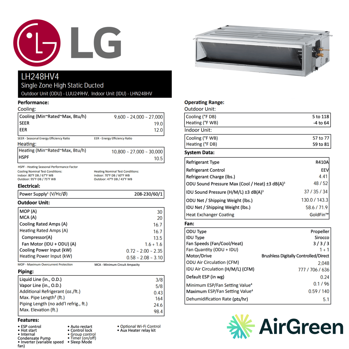 Dans un monde où le confort domestique et la performance énergétique sont au cœur des préoccupations des consommateurs, AirGreen se positionne comme leader dans le domaine de la CVC à Montréal, Laval, Longueuil, ainsi que sur les Rives Nord et Sud. Notre produit phare, le ventilateur de gaine à haute pression statique LG de 24 000 BTU, représente l'excellence en matière de climatisation et de chauffage. Cet appareil, doté d'un numéro de série LHN248HV, allie puissance, efficacité énergétique, et discrétion, faisant de lui un choix incontournable pour les particuliers et les professionnels à la recherche d'une solution CVC optimale.