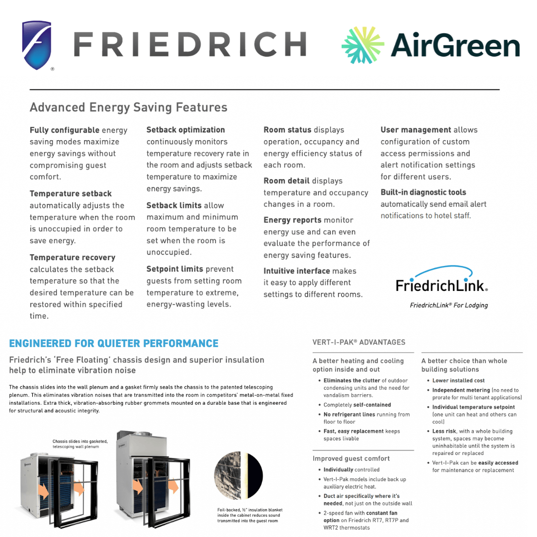 Le VERT-I-PAK de Friedrich dispose d'un design de châssis flottant qui réduit le bruit dû à la transmission des vibrations. Il est également équipé d'une isolation avec dos en feuille de 1,3 cm pour minimiser davantage la transmission du son dans les pièces. Avec une efficacité de 11,0 EER et 3,3 COP pour tous les modèles, il témoigne de son efficacité énergétique.